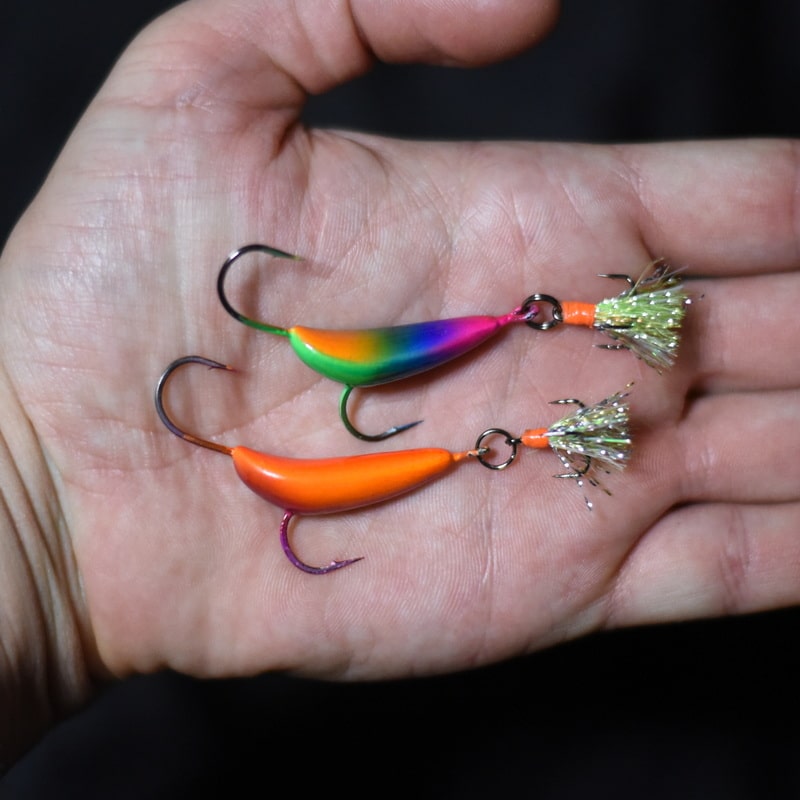 Уникальная зимняя блесна преимущественно для ловли судака в отвес. Содержит в себе два основных крючка и дополнительный тройник в заводном кольце для крепления. Покрытие блёсен светится под ультрафиолетом.