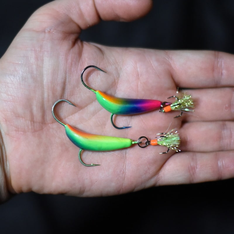 Уникальная зимняя блесна преимущественно для ловли судака в отвес. Содержит в себе два основных крючка и дополнительный тройник в заводном кольце для крепления. Покрытие блёсен светится под ультрафиолетом.