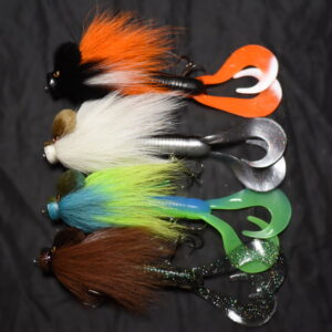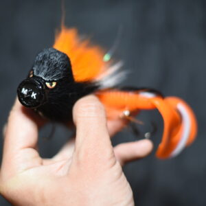 Это приманка-бактейл ручной работы Максима Ковязина из Кирова, предназначенная для ловли щуки и тайменя. При изготовлении опушения мыши используется натуральный мех оленя. Приманка массой 37 грамм, медленно тонущая. Тройники фирмы BBK.