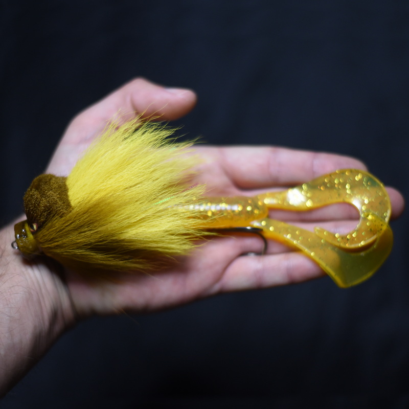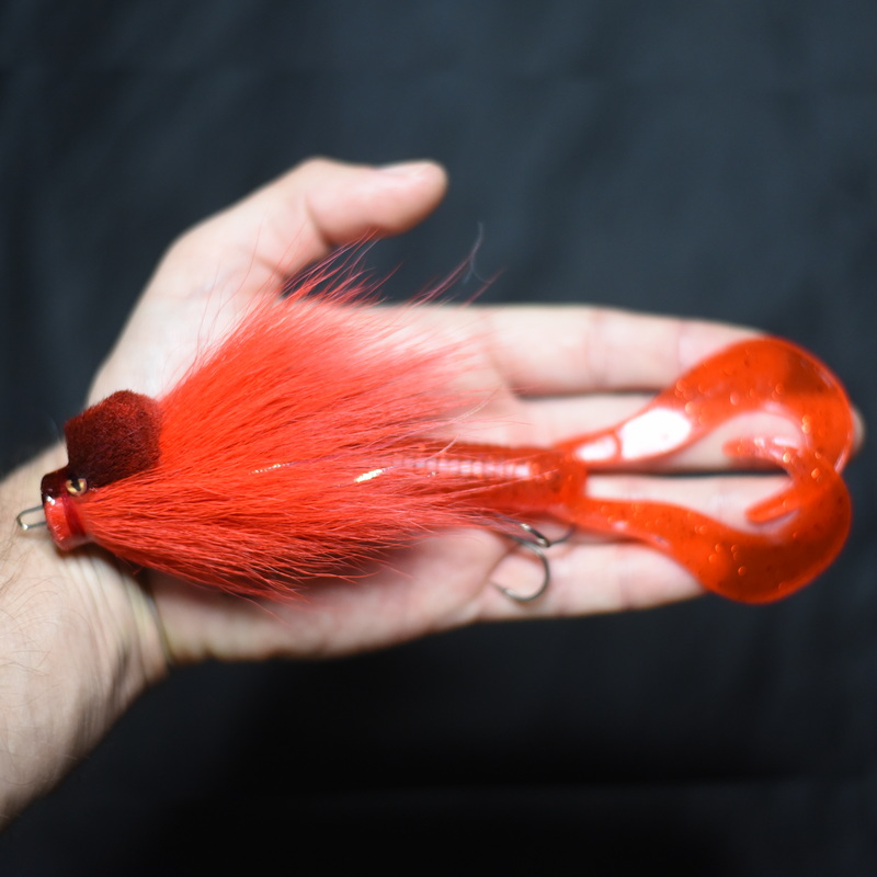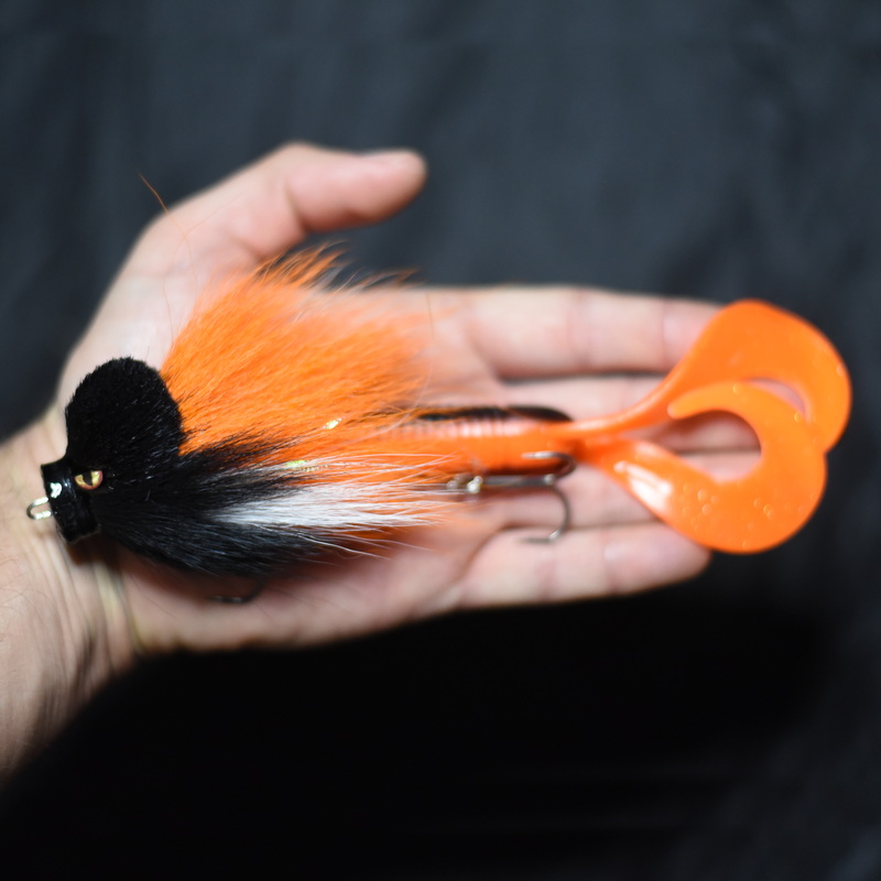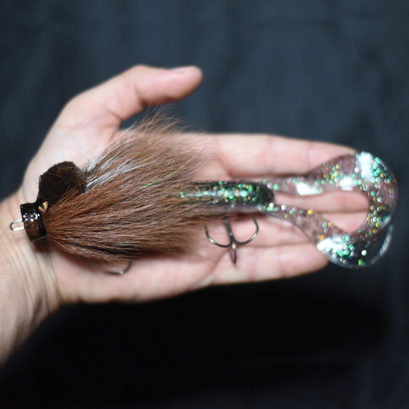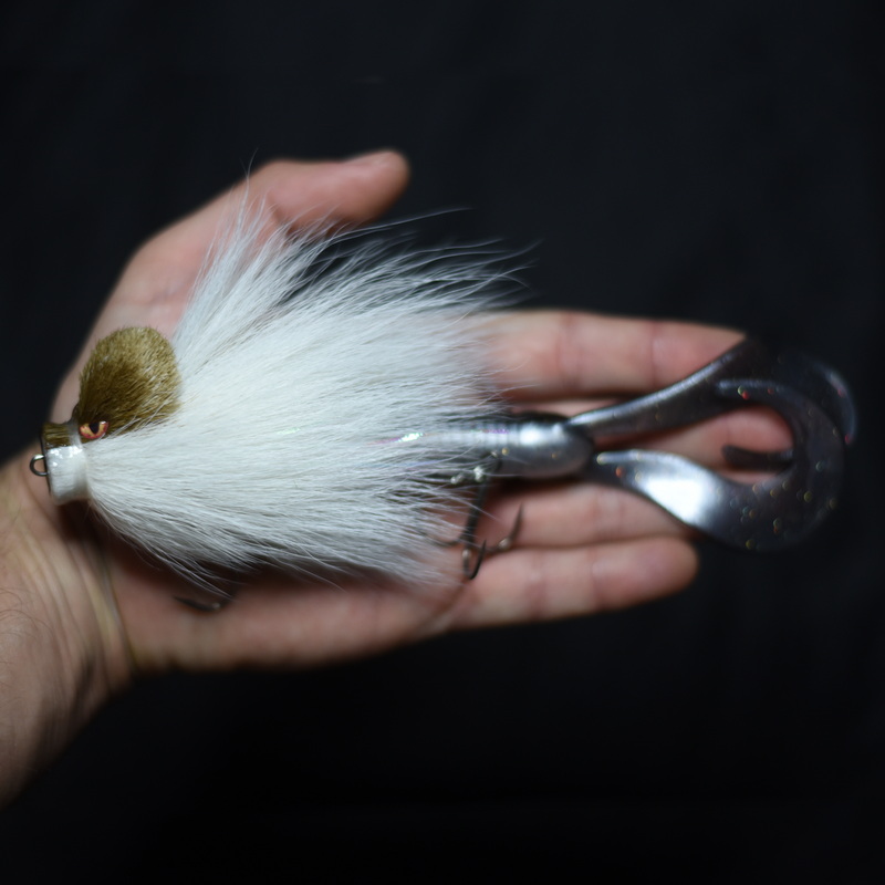 Это приманка-бактейл ручной работы Максима Ковязина из Кирова, предназначенная для ловли щуки и тайменя. При изготовлении опушения мыши используется натуральный мех оленя. Приманка массой 37 грамм, медленно тонущая. Тройники фирмы BBK.