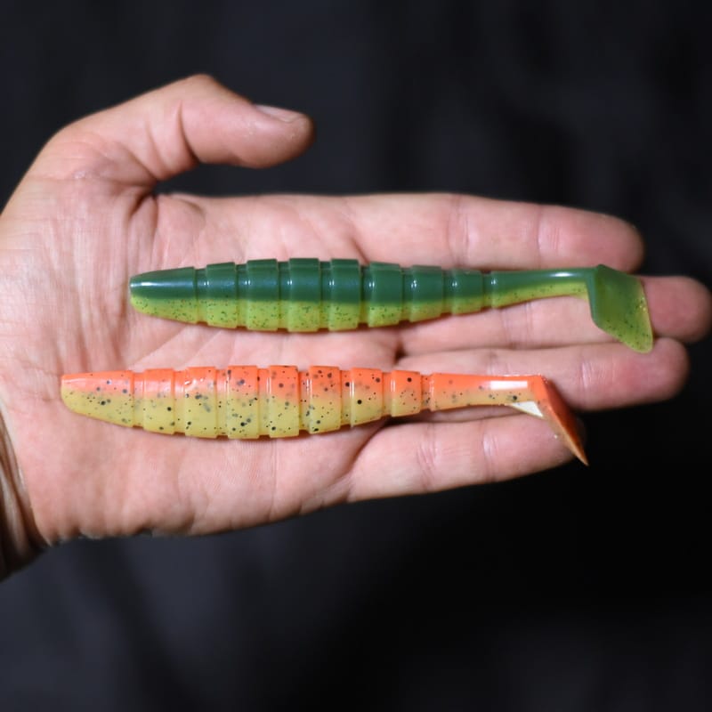 Универсальная модель средне-крупных размеров с достаточно объемным сегментированным телом формы в стиле “шед” и оригинальной рубленой пяткой в форме вытянутого сверху вниз пятиугольника. Разрабатывалась в первую очередь для ловли хищника в водоемах с течением и допускает самые разные приемы анимации: от классической джиговой ступеньки до равномерной проводки. Оснащаю чаще всего на джиг-головке 4/0-5/0 или двойнике 2/0, чуть реже – на оффсете №4/0.