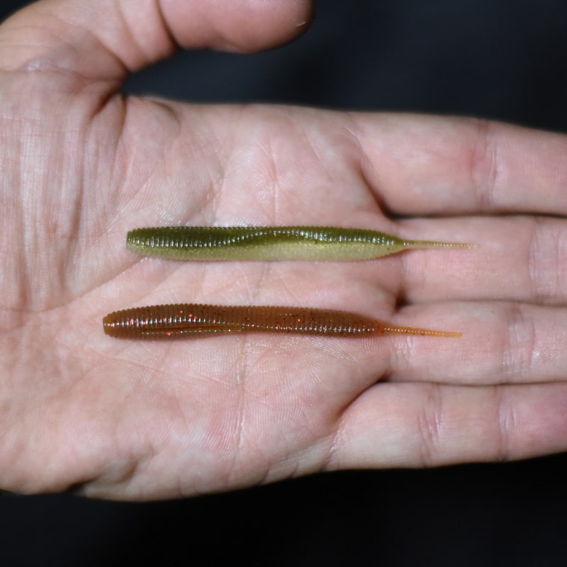 Легендарный червь от японской компании Keitech в размере 2,8 дюйма. Оснащаю чаще всего на оффсете №2, чуть реже – на одинарном крючке Gurza S-59 (номер 4-1) или двойнике 4-го номера. Весьма реалистичная игра на проводке, которую нужно производить с паузами и дрожанием на месте.