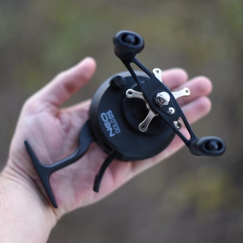 Проверенная годами конструкция передачи, магнитная система торможения шпули. Увеличенная по длине и усиленная лапка катушки, а также шпуля большого диаметра из черного анодированного алюминия. Карбоновые диски фрикциона. Сам фрикцион регулируется плавно и имеет максимальное усилие в 4 кг. Шпули катушек Neo Black и Neo Gold DS взаимозаменяемы. На сегодня катушки FolkFishing с самым большим диаметром шпули в классе зимних мультов в мире.